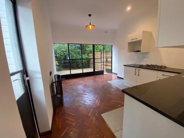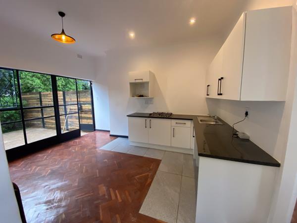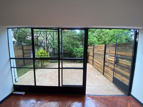 It is a gorgeous, pet-friendly apartment with a small front garden and large back garden perfect for small dog and it has a fireplace! It has parqet floors, gorgeous Italian Tiles, long granite counters, electric fencing, modern kitchen with a gas hob, a classic bathroom with rain water shower head & gas geyser. It also has built in cupboards in the bedroom. Unfurnished.