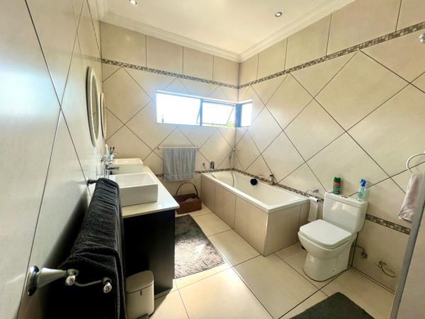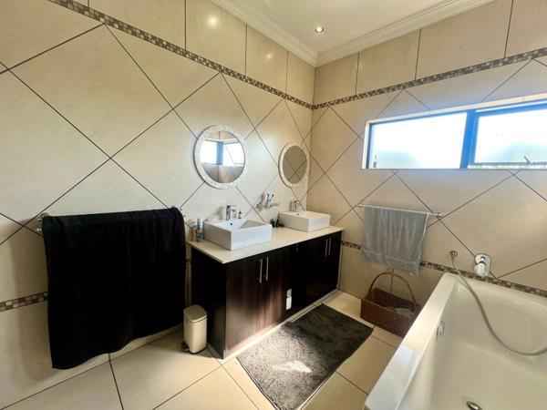 The outdoor area is designed for relaxed family living and entertaining, featuring a covered patio with a built-in braai overlooking an established garden with ample space for children to play. Additional features include a staff room with shower facilities and a double automated garage with direct access into the home.