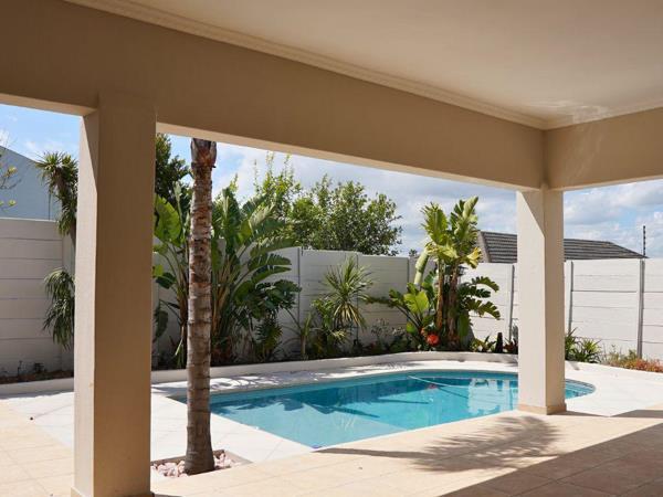 The main living area overlooks the stunning garden and pool area, The outdoor undercover entertainment area has a built in braai and server unit for added convenience when entertaining.